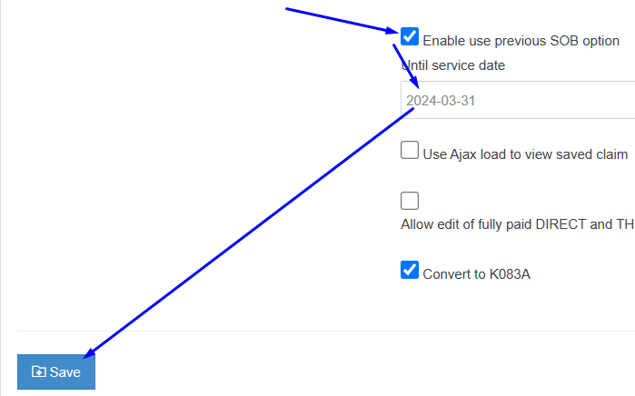 Be mindful that the Date and checkbox in theEnable the use previous SOB option in the SysAdmin \ Claim Setup \ Claim Settings page will need updating with each new SOB fees release.